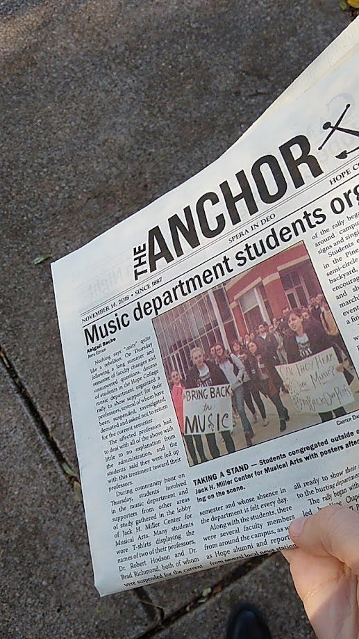 Senior year I watched the music department crumble from within, as half of the administration turned on our beloved choir professor who had taken us to South Africa. He was tenured but they forced him out anyway, and I watched professors I respected come to the wrong conclusions- take the twisted facts that they had been presented with and decide he had been some sort of villain. I knew the truth and I lost any remaining veneer of certainty that the grownups would know what to do, or that things would just work out. He and his wife (one of the kindest, gentlest, most badass ladies I’ve ever met7) were essentially fired and forced out of town and it cast a huge pall on the year. We protested and tried to make a difference and got on TV, and none of it mattered. It was a preview to so many things, that senior year just before Covid, before BLM and the second Trump administration and ICE and the fall of democracy.